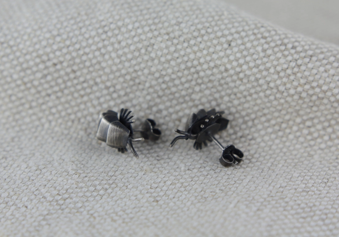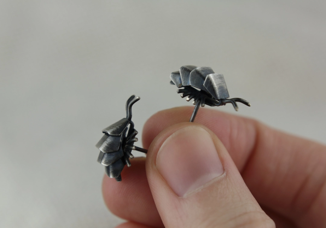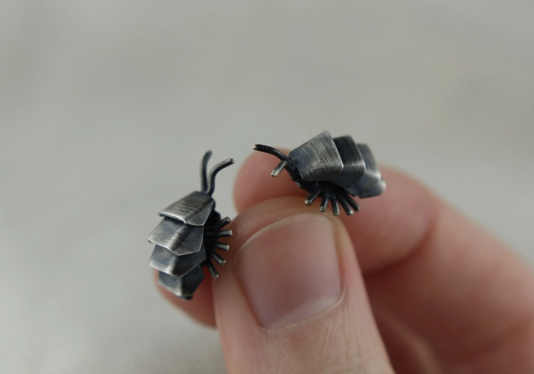 Kolczyki w kształcie chrząszczy (eksperci od bezkręgowców wszelakich zbulwersowaliby się, że przecież to skorupiak) wykonane ręcznie ze srebra pr. 925 tradycyjnymi technikami jubilerskimi, patynowane i przecierane dla uzyskania satynowego wykończenia (jeśli marzy Ci się inny sposób wykończenia – napisz do mnie).
